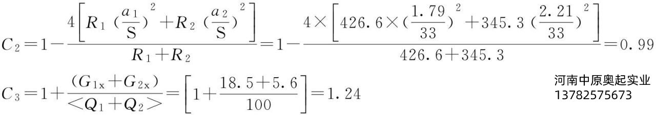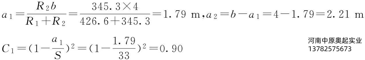 R1=(Φ2ξ1+Φ4G1x)/2=(1.24×1000×0.5+1.26×185)/2=426.6kNR2=(Φ2ξ2+Φ4G2x)/2=(1.24×1000×0.5+1.26×56)/2=345.3kN